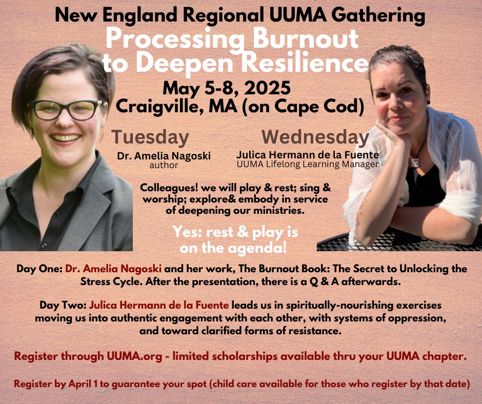 Welcoming members of other chapters, the four UUMA chapters in New England are coming together to learn, share, and grow. Registration closes on April 18, 2025. Requests for child care must come in by April 1.
