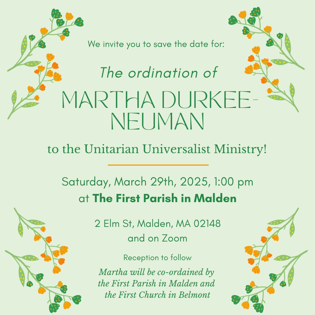 Ordination ceremony for Martha Durkee-Neuman will take place on Saturday, March 29th, at 1:00pm with reception to follow, at the First Parish in Malden and online on Zoom. Martha will be co-ordained by the First Parish in Malden and the First Church in Belmont to the Unitarian Universalist ministry.